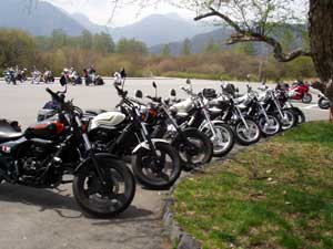 散策しているうちにもうお昼。そろそろ移動しましょう。 バイクに戻って出発。戦場ヶ原を目指します。峠越えでいくらはコーナリングの練習をば。 戦場ヶ原到着〜。駐車場にはたくさんのバイクが止まっていました。